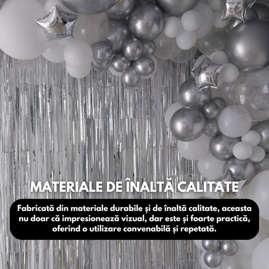 Materiale Calitative: Perdeaua este confectionata din materiale de inalta calitate, astfel incat sa reziste la uzura repetata si sa ofere o stralucire vibranta de lunga durata. Aceasta este fabricata dintr-un material rezistent, care nu se deterioreaza usor, ceea ce inseamna ca o puteti utiliza de mai multe ori pentru diferite evenimente fara sa va faceti griji cu privire la calitate.