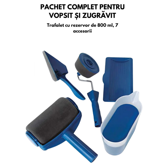 Pachetul complet pentru vopsit si zugravit S DEPOT® ofera o solutie eficienta si rapida pentru orice proiect de zugravit. Acest set profesional iti permite sa vopsesti pereti, tavane sau garduri fara a face dezordine si fara a pierde timp cu imbibarea trafaletului in vopsea. Sistemul inovativ cu rezervor integrat elimina nevoia de a folosi traditionalele tavite pentru vopsea, iar trafaletul asigura o acoperire uniforma, fara scurgeri sau stropi nedoriti.