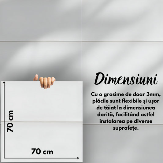 Autoadeziv: Plăcile sunt autoadezive, eliminând necesitatea utilizării unui adeziv suplimentar, ceea ce simplifică montajul.